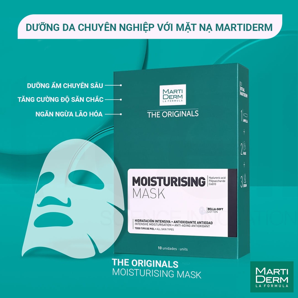 Làn da luôn cần được cung cấp đủ độ ẩm để duy trì sự mềm mại, đàn hồi và tươi trẻ. MartiDerm The Originals Moisturising Mask là dòng mặt nạ dưỡng ẩm chuyên sâu đến từ thương hiệu dược mỹ phẩm MartiDerm nổi tiếng của Tây Ban Nha. Sản phẩm được thiết kế đặc biệt giúp cấp nước, làm dịu làn da khô ráp, đồng thời hỗ trợ tái tạo làn da khỏe mạnh, căng bóng.